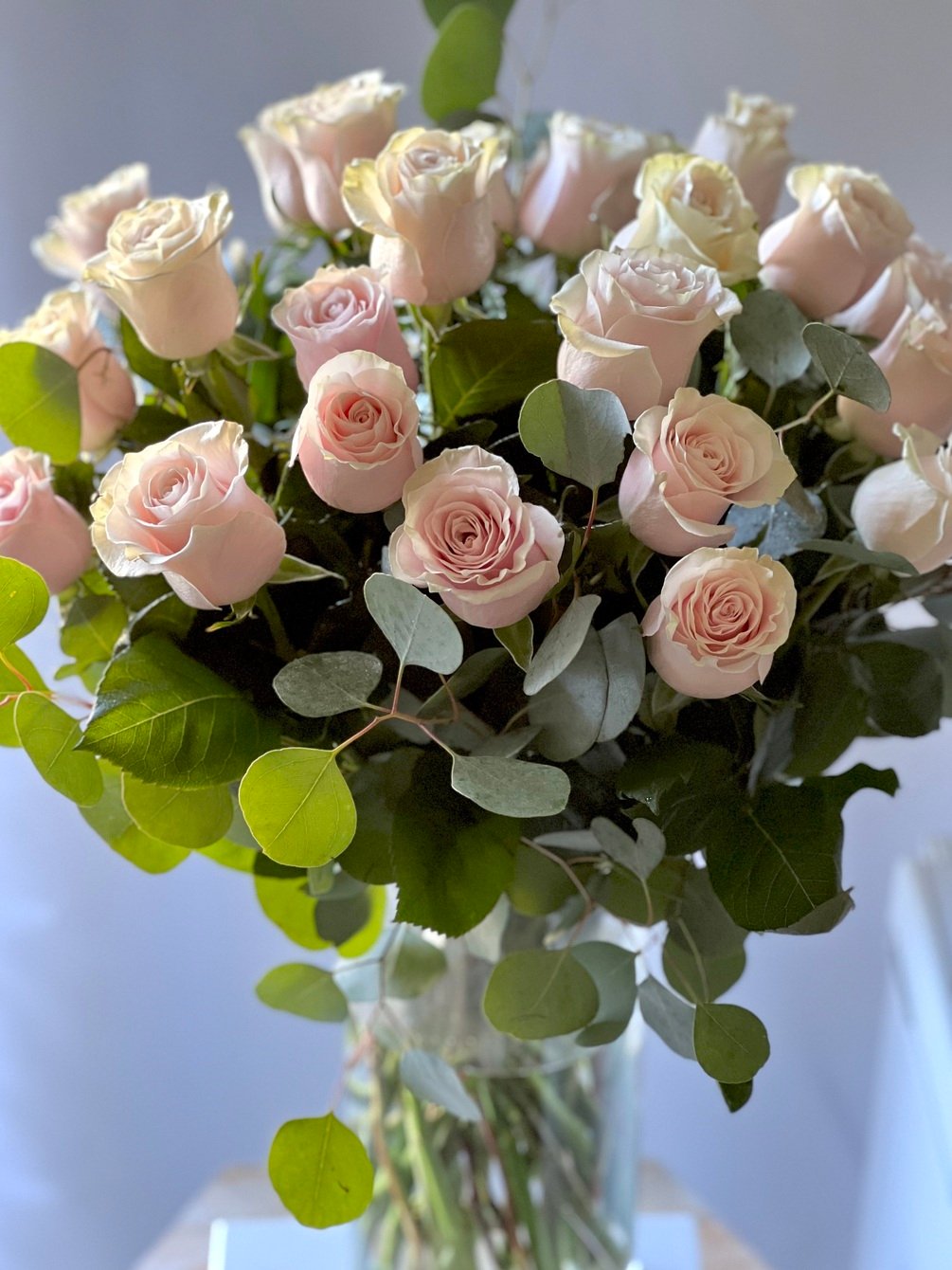 2 Dozen premium, light pink, long stem roses in a 12” x 6” glass cylinder vase with eucalyptus & lemon leaf greenery!