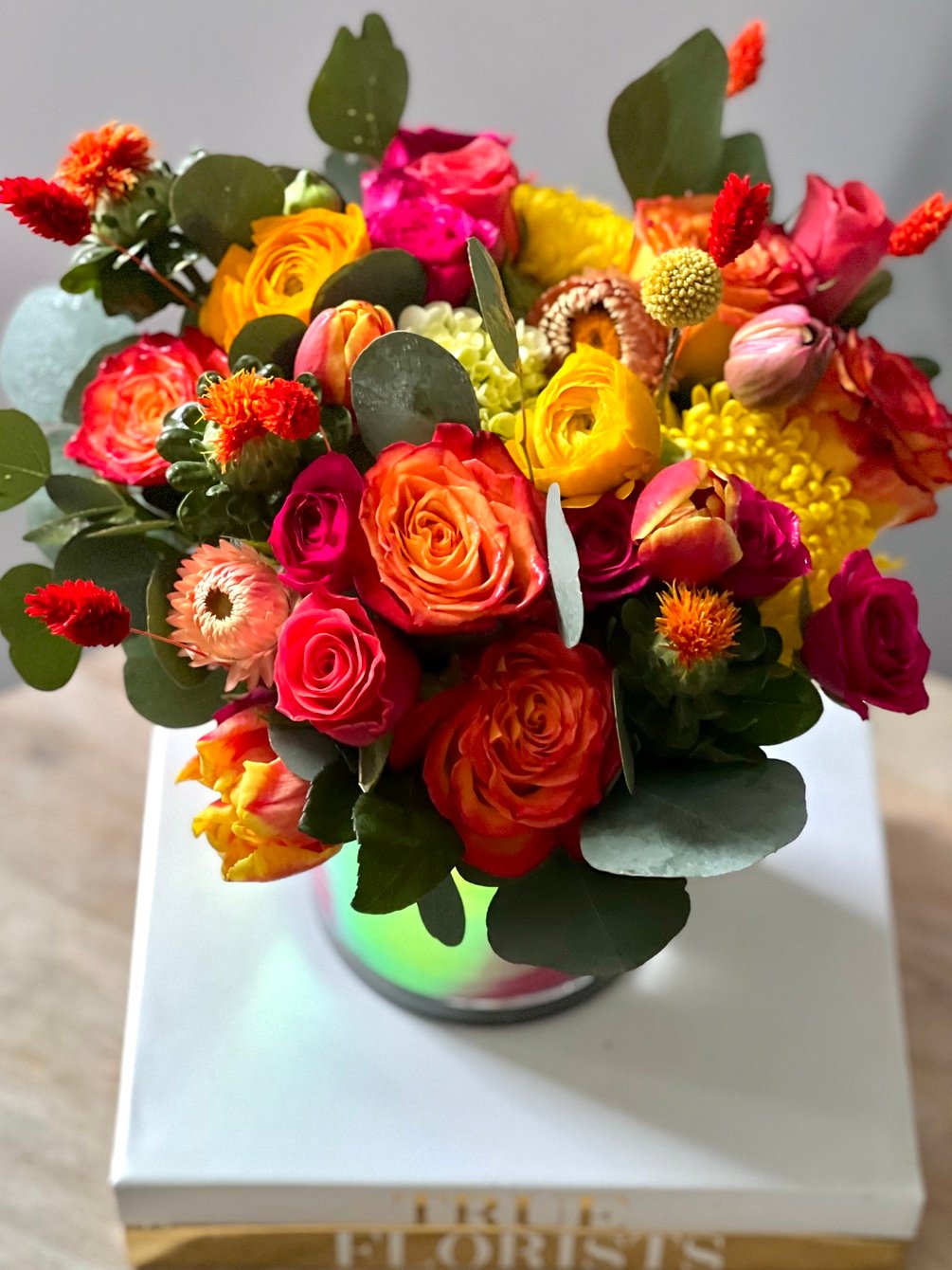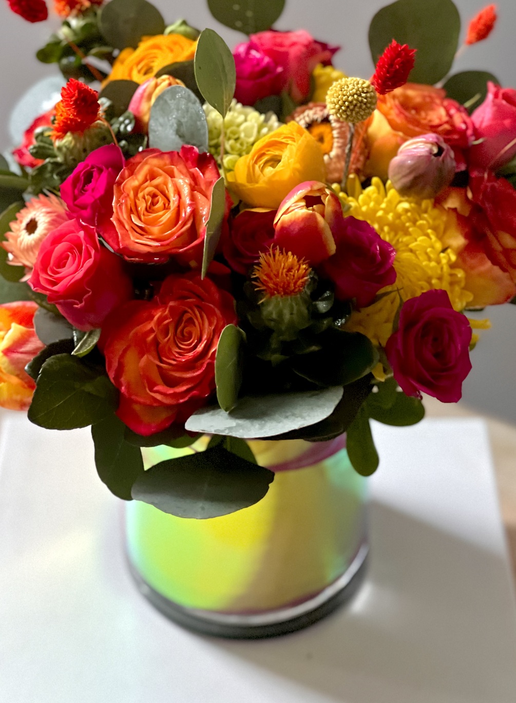 This arrangement is low & lush in our 5”x 5” glass vase. Filled with flowers & colors that are reminiscent of a stunning sunset! This vase comes with a holographic liner inside simulating the colors of a beautiful sunset! 🌅