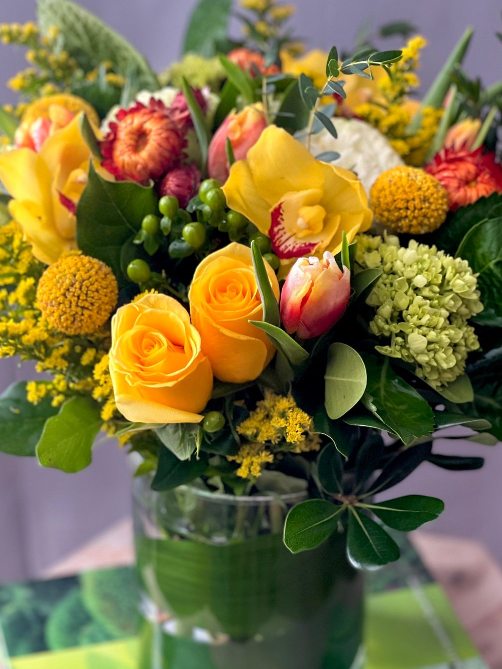 Yellow, orange and green flowers in our 8” x 5” glass cylinder vase!