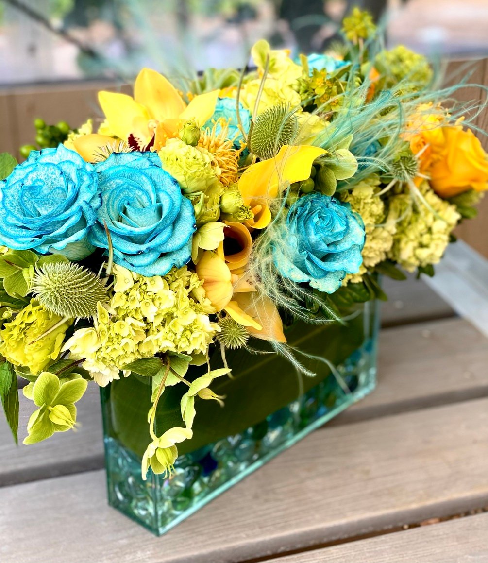Rectangular glass vase (7"H x 3"W x 12"L) filled with unique blue, yellow and green flowers!